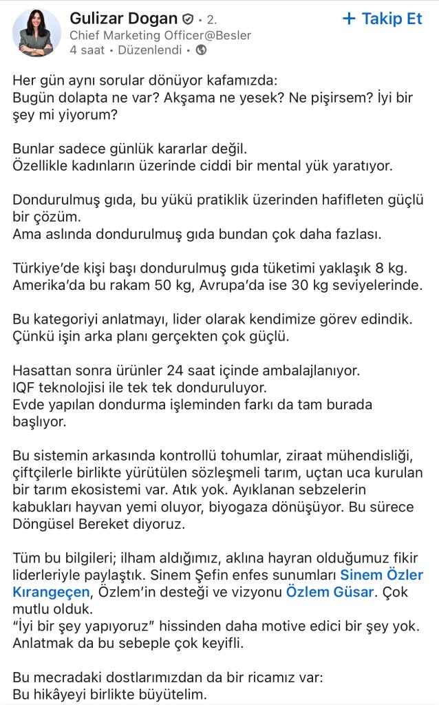 Besler CMO’su Gülizar Doğan, LinkedIn’de yaptığı içten paylaşımla hepimizin hayatına dokunan bir konudan söz etti: “Bugün dolapta ne var? Akşama ne yesek?”