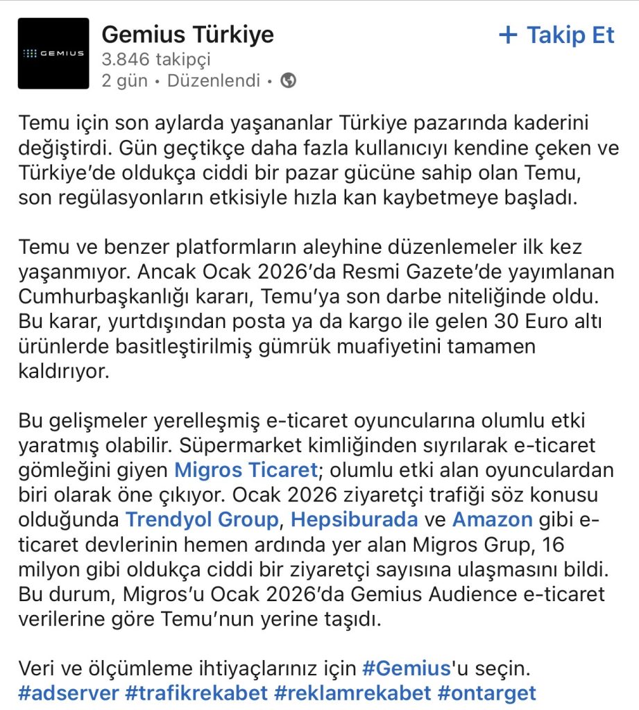 Gemius Audience tarafından açıklanan Ocak 2026 e-ticaret verilerine göre, Migros Grup, ziyaretçi trafiği bakımından Temu’nun yerine geçti. Gemius’un resmi LinkedIn hesabında paylaşılan veriler, bu dönüşümü açık şekilde ortaya koydu.