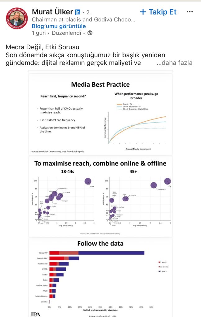 Bu değerlendirmenin yalnızca saha deneyimlerine dayanmadığını belirten Ülker, pazarlama dünyasında referans kabul edilen Les Binet’in uzun soluklu araştırmalarına işaret etti. Binet’in çalışmalarına göre medya planlamasında kritik unsur mecra tercihi değil, erişimin genişliği. Ülker, kalıcı etki yaratan kampanyaların dijital ve geleneksel mecraların dengeli kullanımıyla mümkün olduğunu ifade etti.