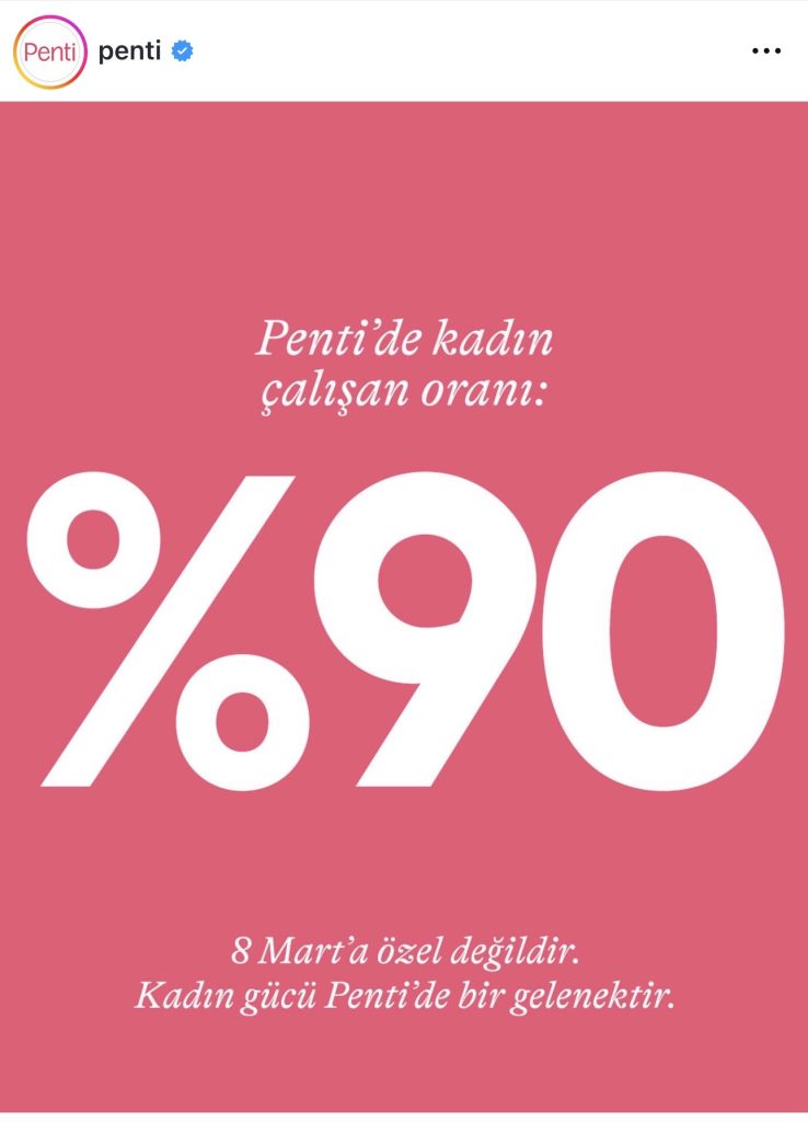 Çorap ve iç giyim devi Penti, bu yılki 8 Mart iletişimini sade ama güçlü bir veriyle şekillendirdi: Penti’de kadın çalışan oranı yüzde 90. Marka, sosyal medya paylaşımında şu notu düştü: “8 Mart’a özel değildir. Kadın gücü Penti’de bir gelenektir.”