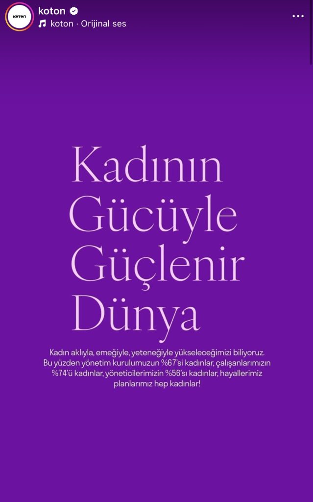 “Biz kadın markasıyız” söylemini kurumsal verilerle destekleyen markalardan biri de Koton oldu. Yüksek etkileşim alan paylaşımında marka, üç kritik rakamı öne çıkardı: Çalışanların yüzde 74’ü, yöneticilerin yüzde 56’sı ve yönetim kurulunun yüzde 67’si kadınlardan oluşuyor.