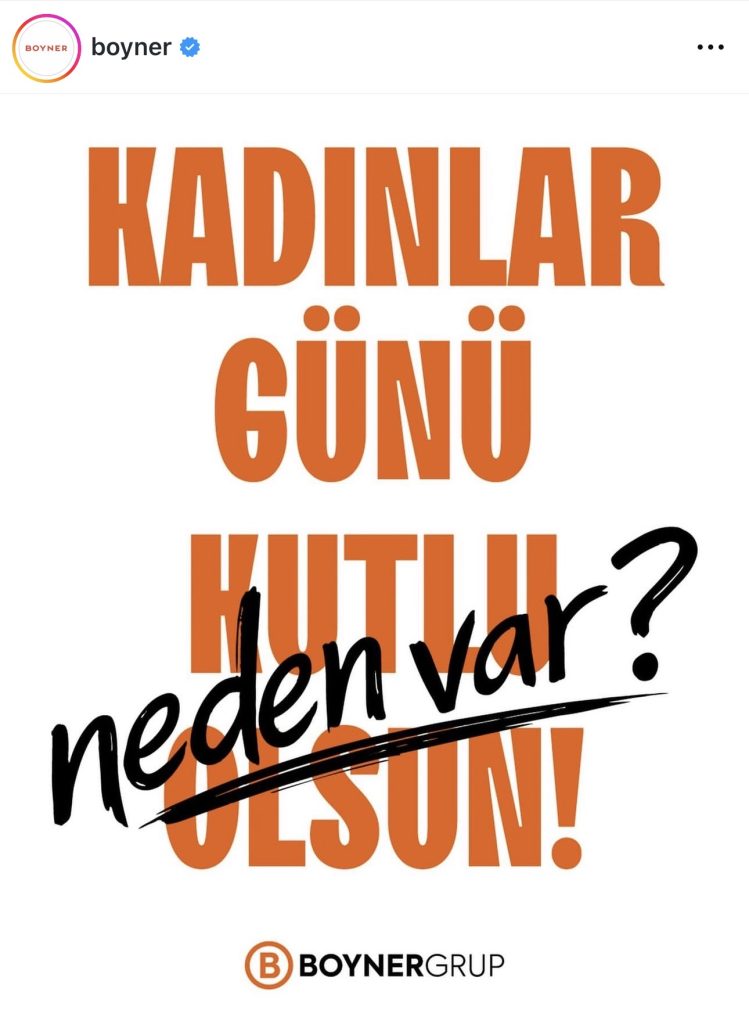 Sektörün en dikkat çekici ve cesur iletişimini ise Boyner Grup gerçekleştirdi. “Kadınlar Günü Kutlu Olsun!” ifadesindeki “Olsun” kelimesinin üzerini çizerek yerine “Neden Var?” yazan marka, bu soru işaretiyle toplumsal farkındalık mesajını çok katmanlı bir biçimde verdi.