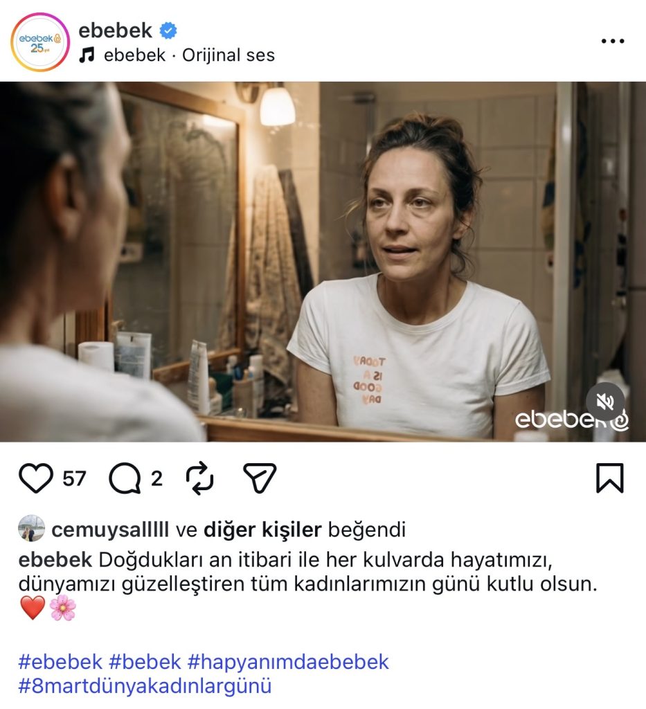 Anne-bebek ürünleri platformu e-bebek ise 8 Mart iletişimini farklı bir duygusal zemine taşıdı. Aynaya bakan yorgun bir kadını gösteren video paylaşımında markanın mesajı şöyleydi: “Doğdukları an itibarı ile her kulvarda hayatımızı, dünyamızı güzelleştiren tüm kadınlarımızın günü kutlu olsun.” Bu sade ve içten mesajla e-bebek, anneliğin ve kadınlığın görünmez emeğine dikkat çekti.