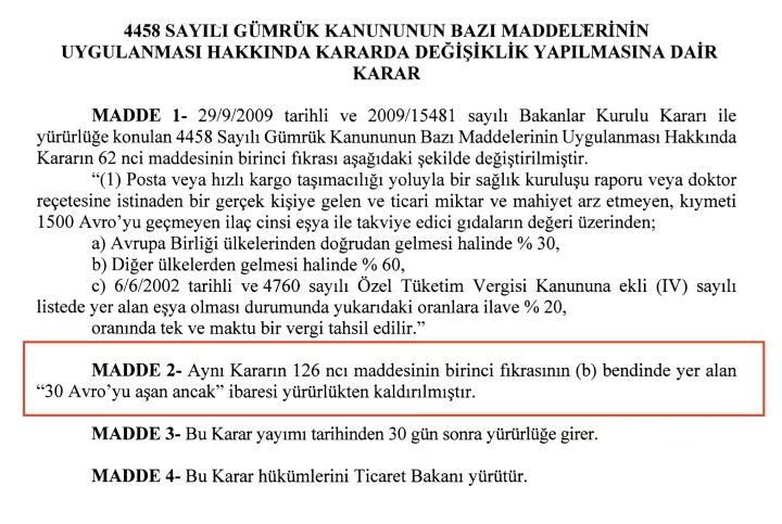 Resmi Gazete’de yayımlanan karar ile yurt dışından gümrüksüz alışveriş limiti kaldırıldı. Daha önce 30 Euro altındaki alışverişlerde gümrük muafiyeti uygulanıyordu.